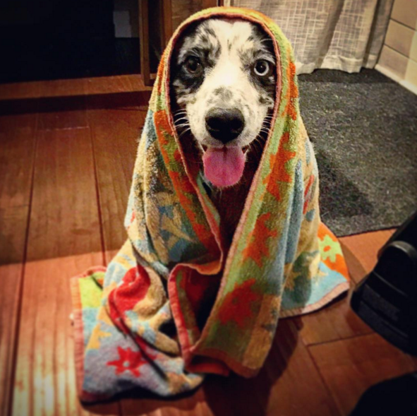 After a fun time outside, Salies sits and waits patiently to be towel-dried before entering her Tumbleweed Cypress. Then she prances around and sniffs whatever is cooking in the kitchen, before taking nap in front of the wood stove. A few hours later, it’s time to do it all over again!