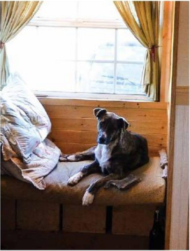 Clark is head over paws with his Tumbleweed Cypress parked in an RV park near Austin, Texas. His favorite place in the whole house is the loft where he enjoys peering through the five windows, scouting the RV park area and, of course, laying on his dad’s pillow and underneath the blankets.