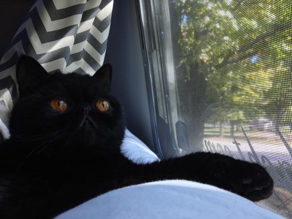 “What can I say, I’m a well traveled cat! I’ve been from the Atlantic to the Pacific and everywhere in between. You’d think by now my owners would learn to park so I can get a little sun in here. ” – Tahoe, on traveling in a tiny space.